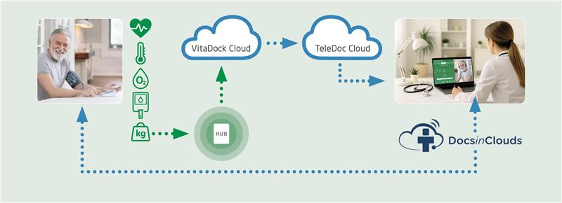 Medizinisches Fachpersonal greift sofort über eine cloudbasierte Plattform – TeleDoc by Docs in Clouds – auf die Daten zu. Dies ermöglicht: